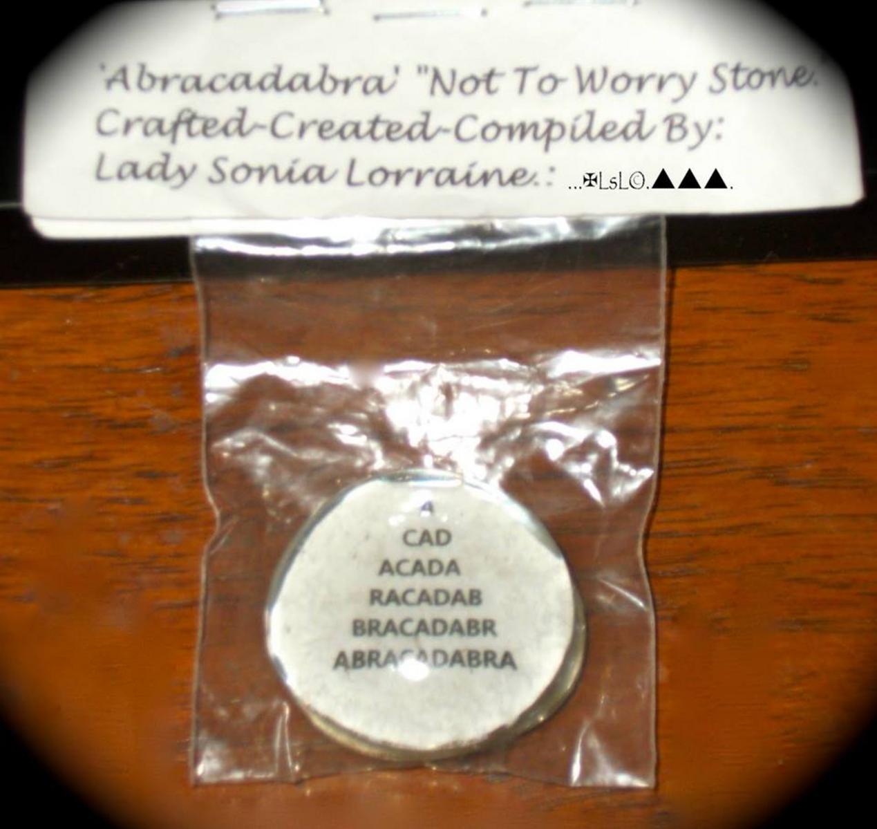 "ABRACADABRA Not To Worry Stone™," (sold in various fashions), Hand Crafted-Created-Compiled-Made By: a Braca Dabra Sonia (Lady Sonia De Lorraine...LsL©), of Renown (i.e. Tarot- Psychic-Clairvoyant-Spiritual Advisor-Guide-Mentor-Celtic Braid). ABRACADABRA Not To Worry Stone™ is an inherently gnostic item by a Braca Dabra Sonia (Lady Sonia De Lorraine ... LsL©).